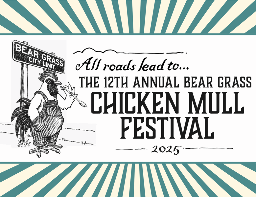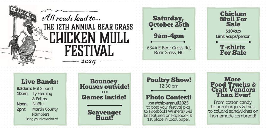 Saturday, Oct. 25th, 9 AM to 4 PM, join in the fun at the 12th Annual Chicken Mull Festival in downtown Bear Grass, NC! The community of Bear Grass welcomes you! Get there early to get your chicken mull. The line will form around 9 AM to 10 AM, and chicken mull will be served WHILE SUPPLIES LAST! Enjoy LIVE MUSIC – Classic Car Cruise-In – Concessions – Lemonade – Freeze Dried Candy – Petting Zoo – Kids Zone – & MORE!