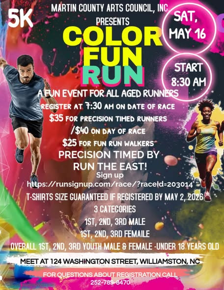 Join the Martin County Arts Council for the most colorful and fun 5K run of 2026, where you’ll be covered head to toe in vibrant hues! This year’s Fun Run is scheduled for Saturday, May 16th, 2026, and will be precision-timed by Run the East LLC. Please sign up HERE. Facebook RSVP HERE.