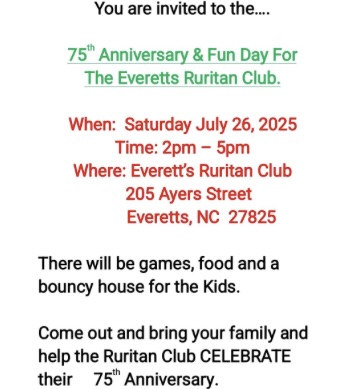 On July 26th, Everetts Ruritan Club will host a 75th anniversary celebration and fun day with games, food, and activities. Join in the fun for this all-ages event in support of the organization!