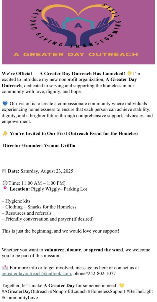 There is a new nonprofit in Williamston, A Greater Day Outreach! Their purpose is to help the homeless people in the area. A Greater Day’s first event is on August 23rd from 11 AM to 1 PM at Piggly Wiggly – 912 Washington St. Please come and support the cause! They’re looking forward to seeing you!