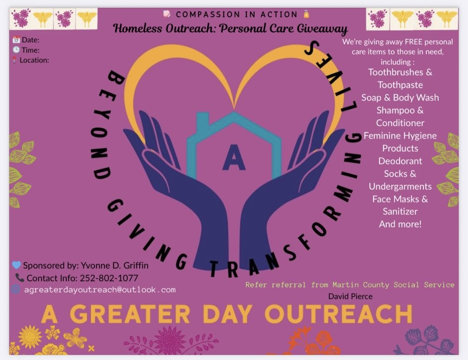 There is a new nonprofit in Williamston, A Greater Day Outreach! Their purpose is to help the homeless people in the area. A Greater Day’s first event is on August 23rd from 11 AM to 1 PM at Piggly Wiggly – 912 Washington St. Please come and support the cause! They’re looking forward to seeing you!