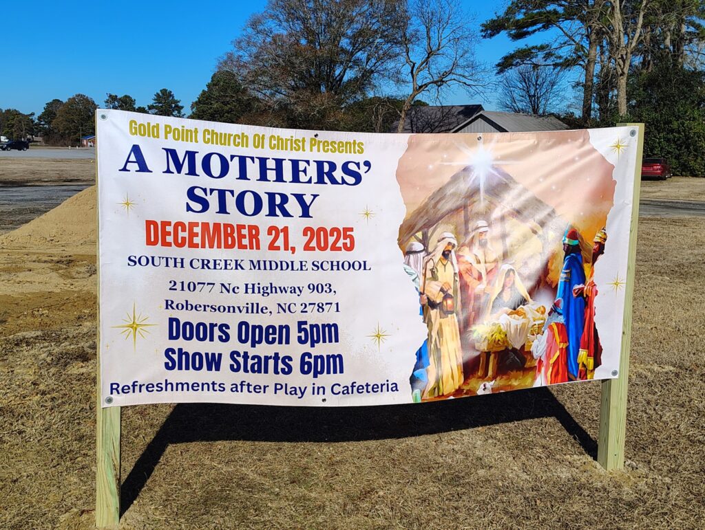 All are invited to join Gold Point Church of Christ for their Christmas play on Sunday, December 21st, at South Creek Middle School. Doors open at 5 PM, and the show begins at 6 PM, followed by refreshments. This is a free event for the entire community. See you there!