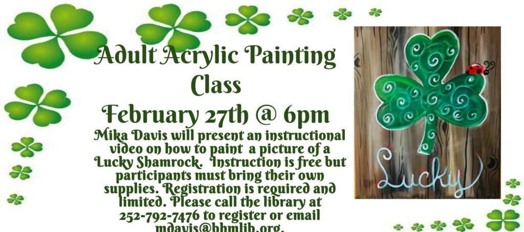 Join library staff, Mika Davis as she presents an instructional video on how to paint a picture of a shamrock. Instruction is free but participants must bring their own supplies. Registration is required and space is limited. Please call the library at 252-792-7476 to register or email mdavis@bhmlib.org.