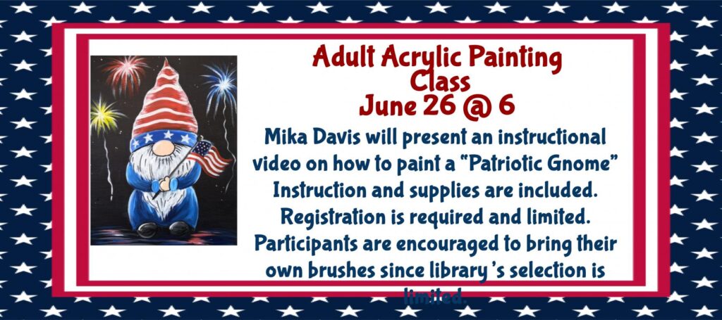 Mika Davis will present an instructional video on how to paint a “Patriotic Gnome” Instruction and supplies are included. Registration is required and limited. Participants are encouraged to bring their own brushes since library’s selection is limited. Please call 252-792-7476 to register or email mdavis@bhmlib.org.