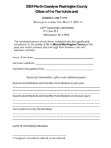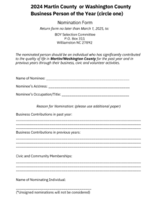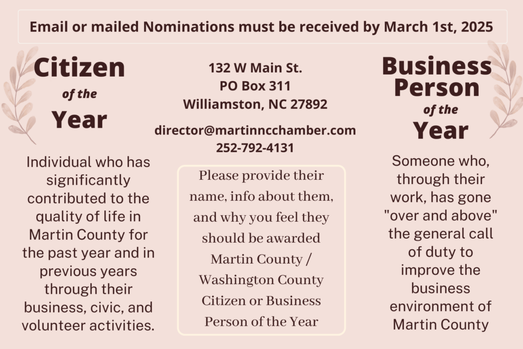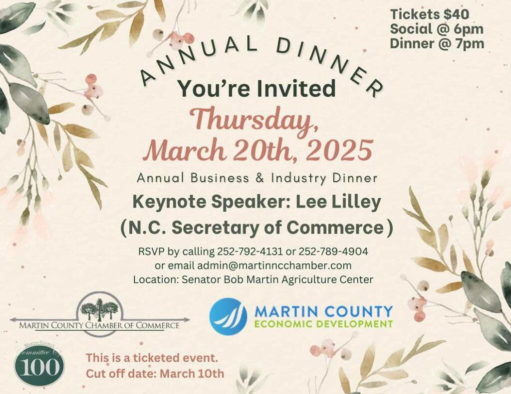 Martin County Chamber of Commerce and Martin County Economic Development Corporation host the annual business and industry dinner on March 20th at Senator Bob Martin Eastern Agricultural Center. NC Secretary of Commerce, Lee Lilley will be the keynote speaker. Tickets are $40. Please RSVP and obtain your ticket by March 10th. To nominate community members for an award, scroll to the bottom of this page for instructions and the form. Nominations are due by March 1st, end of day.