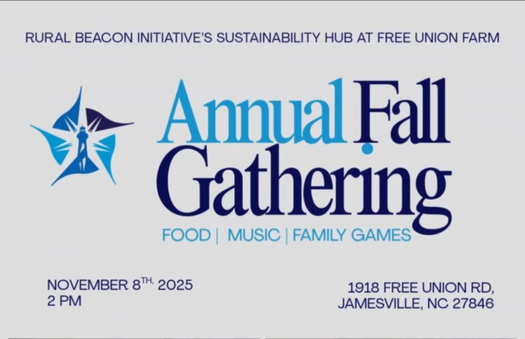 The Rural Beacon Initiative invites everyone to an Annual Fall Festival on Friday, November 8th at 2 PM in the Piney Woods Community! Bring your family and friends for an afternoon of good food, music, and games. Celebrate the harvest season and the growing network of farmers, families, and partners reimagining the future of Southern land stewardship.