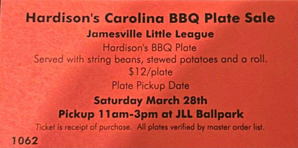 A Hardison’s BBQ Plate Fundraiser for Jamesville Little League is taking place on March 28th! Plate tickets are presale only. Be sure to see your favorite player or reach out to Jamesville Little League at jamesvillelittleleague@gmail.com to purchase a ticket!