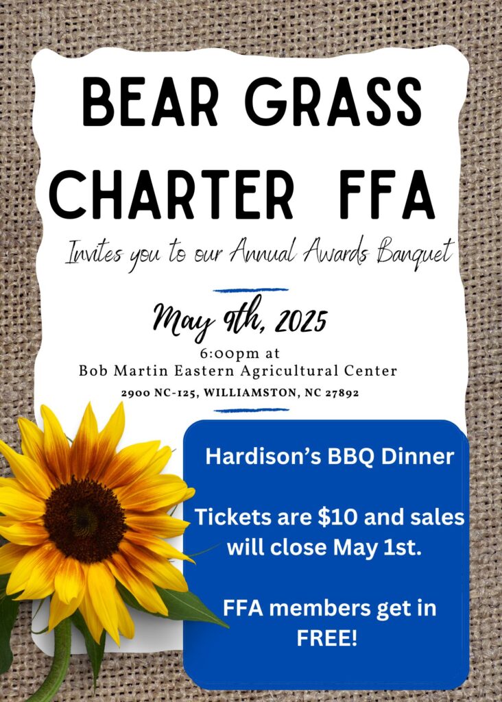 The BGCS FFA Awards Banquet will take place Friday, May 9th. Tickets are free to members and $10 for guests. Tickets may be purchased at the school by Friday, May 2nd.