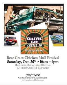 Sat. Oct. 26th, 9am–4pm. Join us for the 11th Annual Chicken Mull Festival in downtown Bear Grass, NC! Come join the community and have some fun!