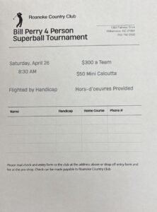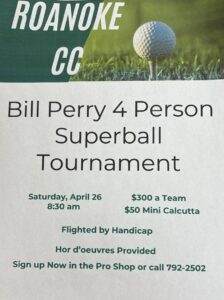 The Bill Perry 4-Person Superball Golf Tournament takes place on April 26th at 8:30 AM. Call 252-792-2502 to sign up!
