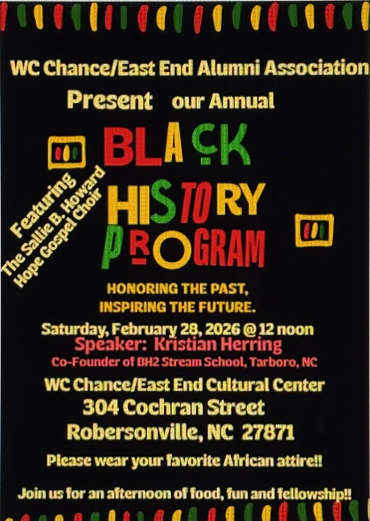 Get ready for the 2026 Black History Program on February 28th at 12 PM, featuring speaker Kristian Herring and Sallie B. Howard School of Arts and Sciences’ Gospel Choir. This event will highlight Black struggles and advancements. Please join for fellowship, food, fun, and more!