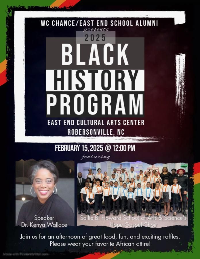 Get ready for the 2025 Black History Program on February 15th at 12 PM, featuring speaker, Dr. Kenya Wallace and Sallie B.Howard School of Arts and Sciences’s Gospel Choir. This event will highlight Black struggles and advancements. Please join us for fellowship, food, fun, and more!