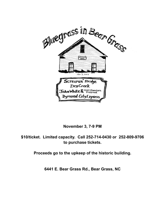 $10 per ticket. Call 252-714-0430 or 252-809-9706 to purchase tickets. Proceeds go to historical upkeep of Bear Grass Primitive Church.
