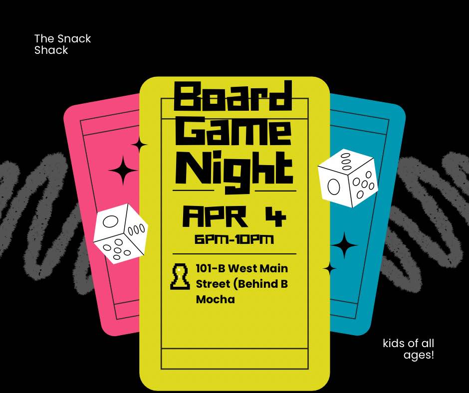 Board Game Night is back this Friday night at the Snack Shack from 6 PM to10 PM! All ages are welcome.