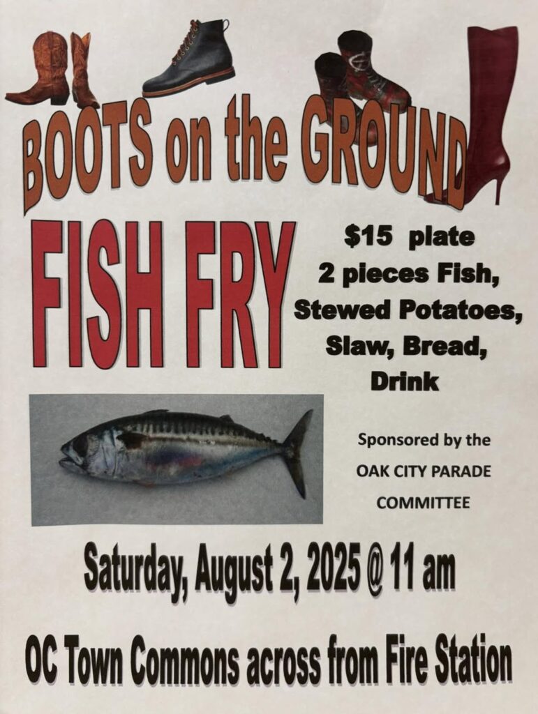 Head out to Oak City on August 2nd, starting at 11 AM, for a fish fry event. Get there early while supplies last! There will be a DJ playing music and baked goods for sale, too!