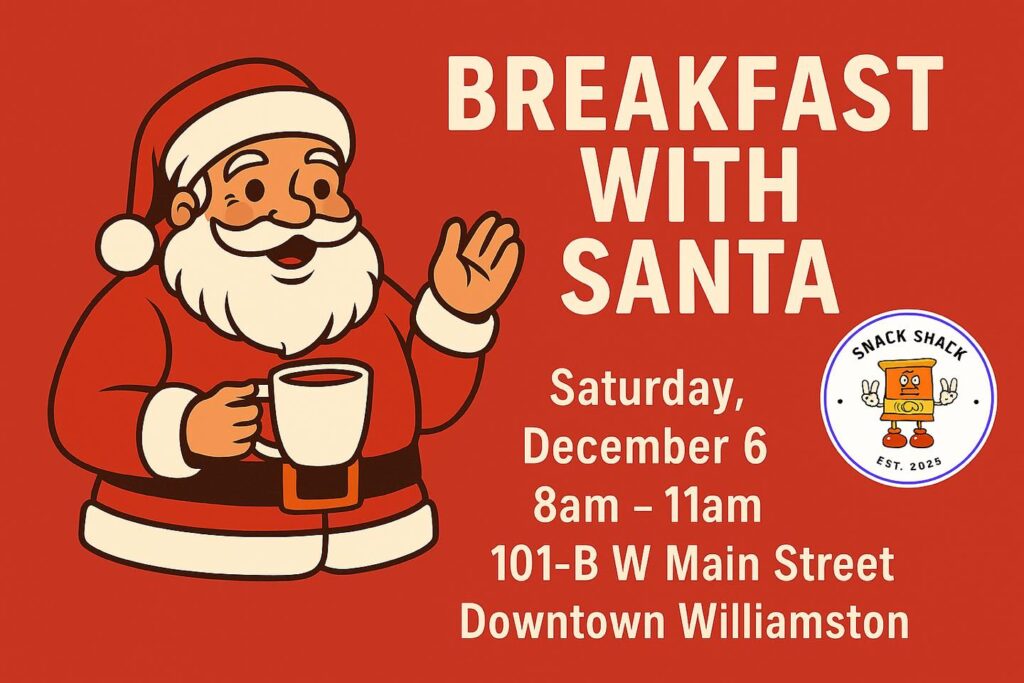 Head to The Snack Shack in downtown Williamston on December 6th to meet Santa and enjoy breakfast with the jolly old fella. Stay downtown for more events throughout the day!