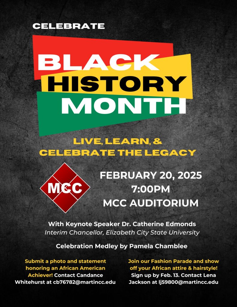 ***UPDATE*** THIS IS CANCELLED AND WILL BE RESCHEDULED DUE TO INCLEMENT WEATHER. Join Martin Community College on February 20th to celebrate Black History Month! Live, learn, and celebrate the legacy with keynote speaker, Dr. Catherine Edmonds and a celebration medley by Pamela Chamblee. Submit a photo to honor an African-American achiever and participate in the fashion parade. More info on the flyer below!
