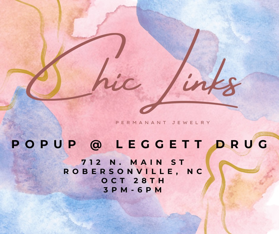 Head to Leggett Drug in Robersonville on Tuesday, October 28th, for a special pop-up event by the locally-owned business, Chic Links. Chic Links specializes in permanent jewelry.