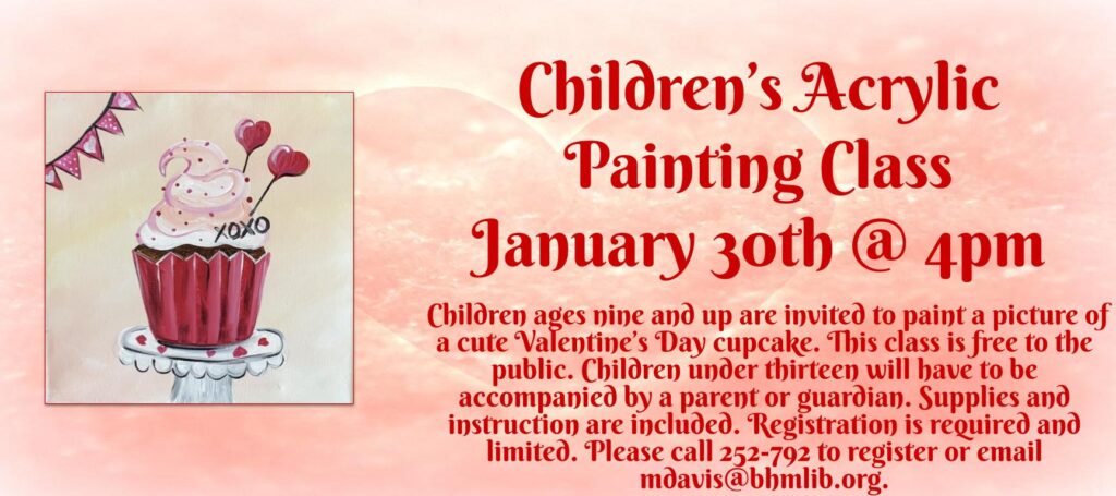 Children ages nine and up are invited to paint a picture of a cute Valentine’s Day cupcake. This class is free to the public. Children under thirteen need to be accompanied by a parent or guardian. Supplies and instructions are included. Registration is required and limited. Please call 252-792 to register or email mdavis@bhmlib.org.