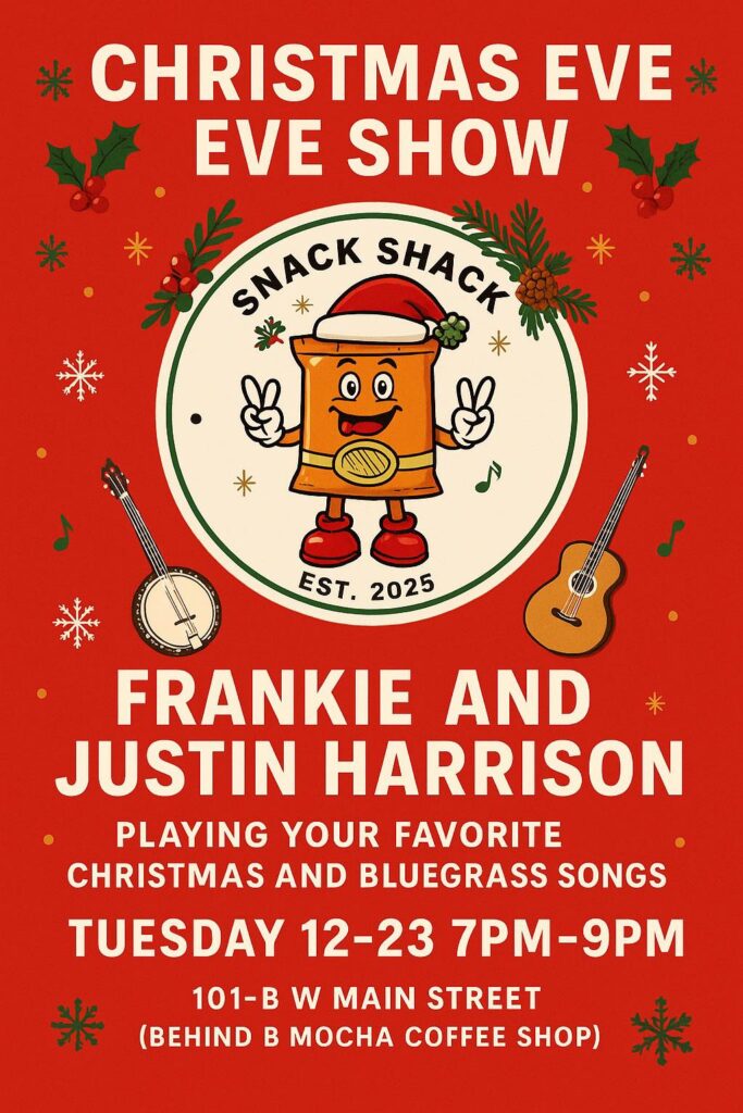 Celebrate Christmas a little early with some live bluegrass music at The Snack Shack! Frankie and Justin Harrison will play bluegrass and Christmas favorites from 7 PM to 9 PM on Tuesday, December 23rd.