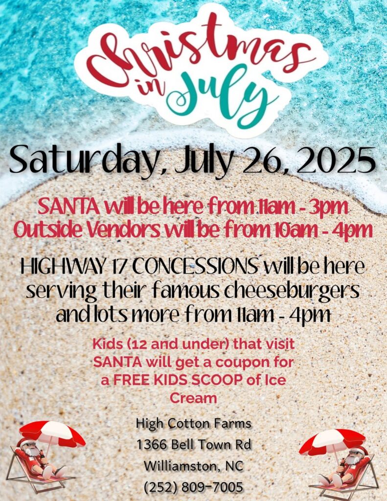 SANTA is coming to town! CHRISTMAS in JULY – this Saturday, 7/26/25! Outside vendors and HIGHWAY 17 Concessions will be there with their food truck and their FAMOUS CHEESEBURGERS. Bring the kids to see Santa and they will get a coupon for a FREE ICE CREAM CONE (12 & under).