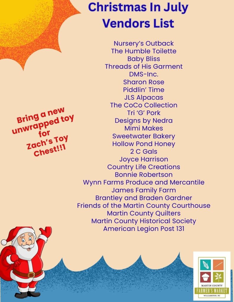 Martin County Farmers Market brings you Christmas in July on Saturday, July 19th. Join in the fun at this special market day! Additionally, the Farmers Market needs your help to fill up the box for Zach’s Toy Chest. Please consider bringing a new unwrapped toy to donate. It will help to bring a smile to a sick child in a local hospital. For more information about Zach’s Toy Chest, check out their website at zachstoychest.org.