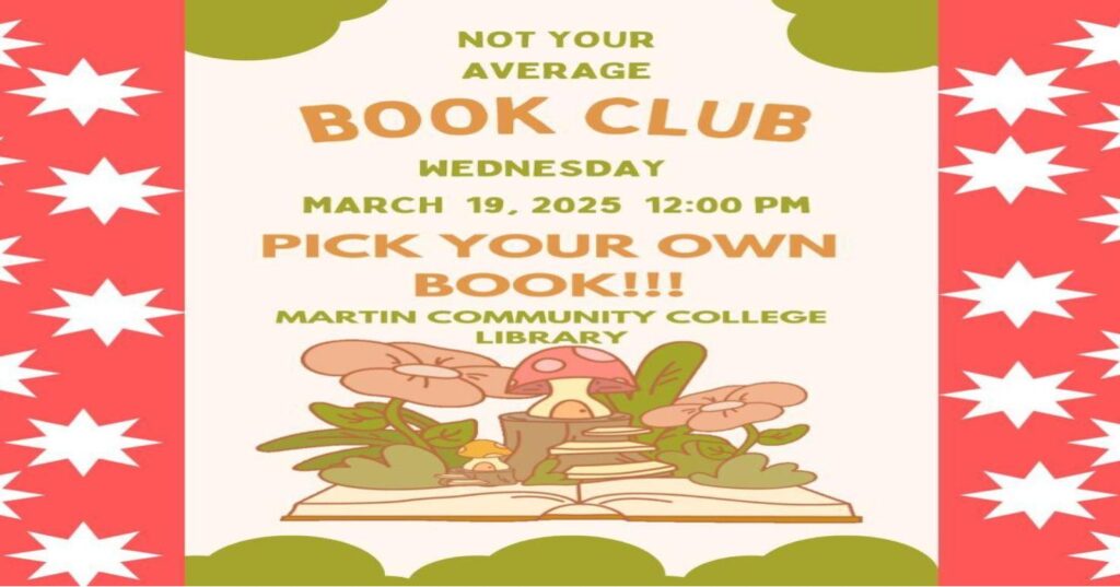 This month, it’s all about you! Choose any book or story that has caught your interest—whether it’s a recent read or an old favorite and come share it with the group. Tell us what you loved, what you didn’t, and what made it stand out to you. No rules, just a fun and free-flowing discussion of the books that matter to you. The discussion will take place at Martin Community College. Don’t forget to bring a dish for the potluck!