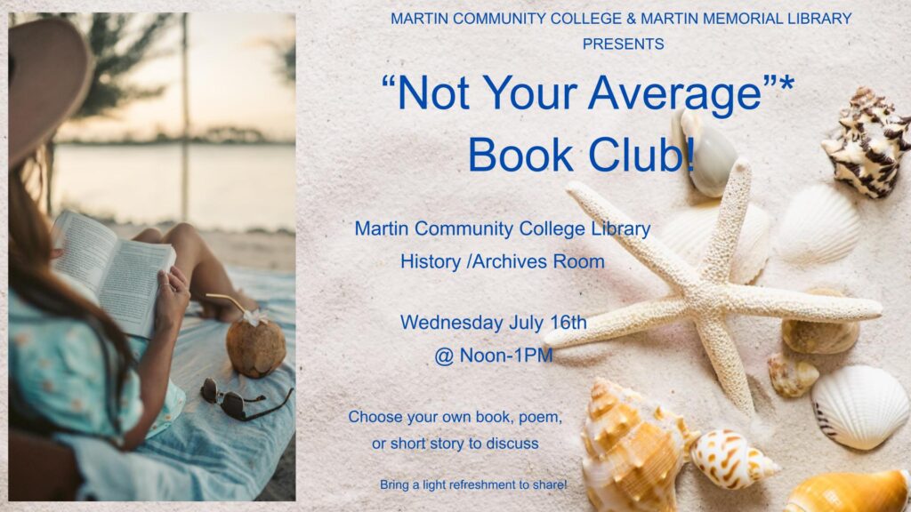 Join staff from Martin Community College Library and Martin Memorial Library for a discussion of your favorite book, short story, or poem. Bring a refreshment or light snack to share with the group.