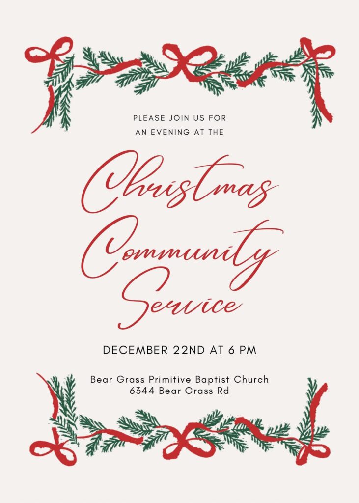 Join us for a very special Christmas service at Bear Grass Primitive Baptist Church on December 22nd at 6 PM.