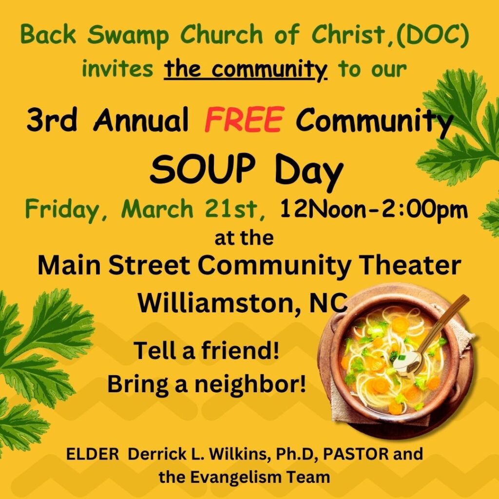 Join Back Swamp Church of Christ for a Free Community Soup Day! Have a FREE warm meal with friendly faces at Community Soup Day — a time of good food, fellowship, and kindness. Everyone is welcome to connect with neighbors. Bring a friend and enjoy a cup of homemade soup made with love!