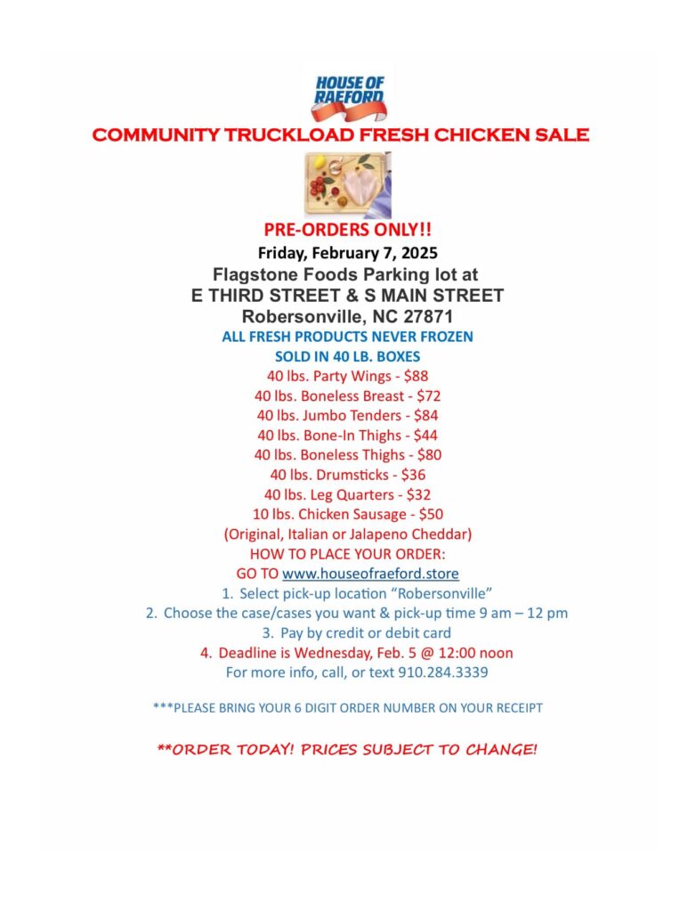 Attention Robersonville and surrounding areas! We bring truckload sales of our fresh 40 lb. bulk boxes of chicken to local communities. One of the last sales before the BIG GAME! Deadline to order for Robersonville Truckload Sale is 2.5.25. Get your orders in today!