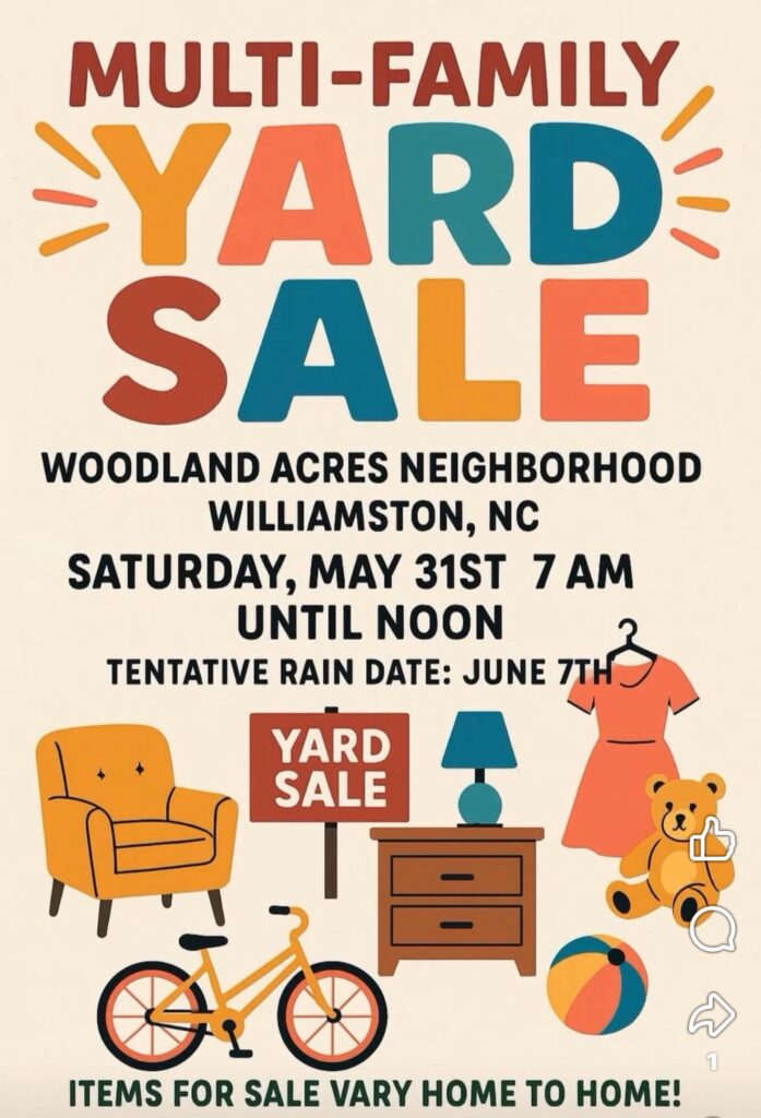 An annual community yard sale takes place on Saturday, May 31st in the Woodland Acres neighborhood off Highway 17. Lemonade will be available as well.