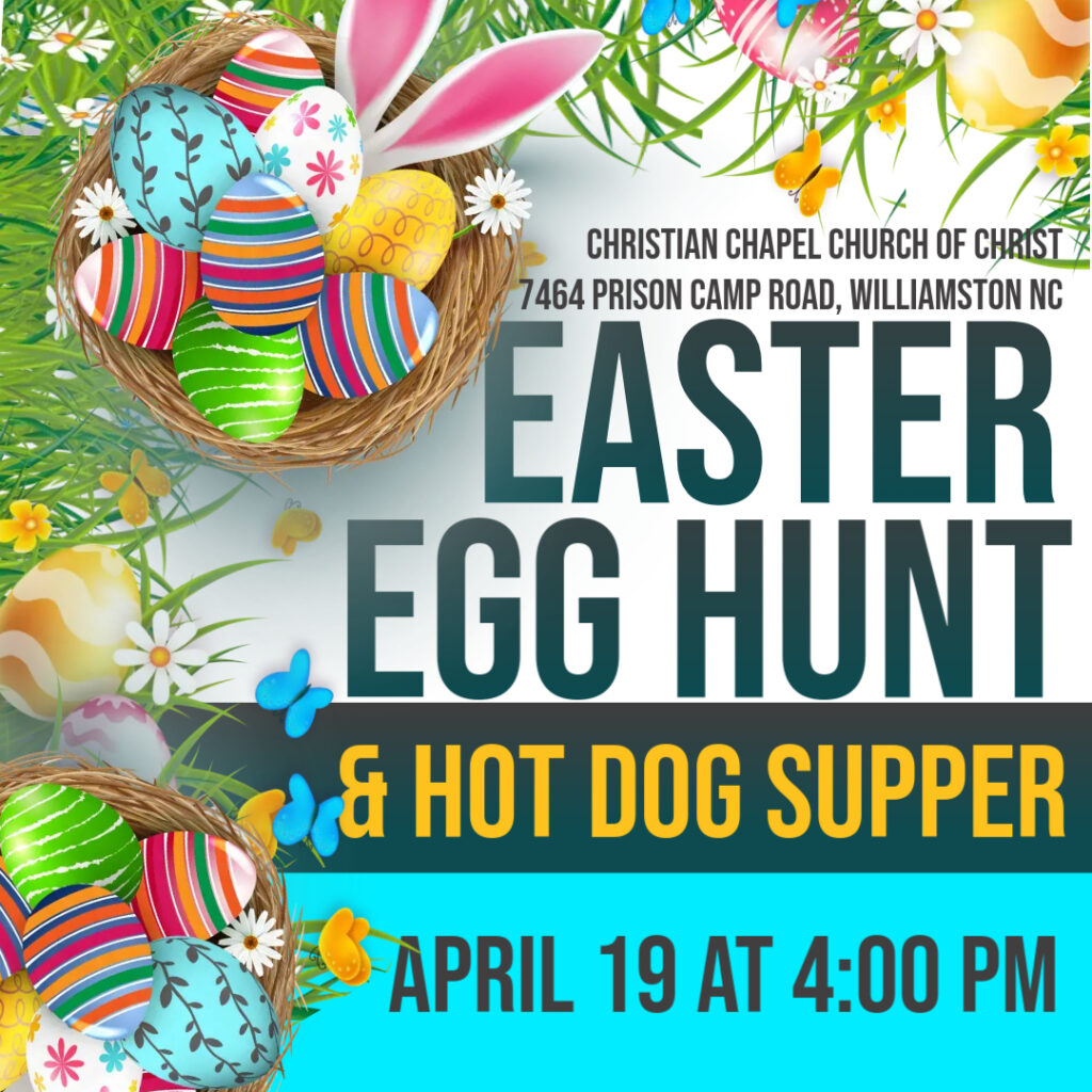Christian Chapel Church of Christ in Williamston is hosting a FREE Easter Egg Hunt & Hot Dog Supper on Saturday, April 19th.
