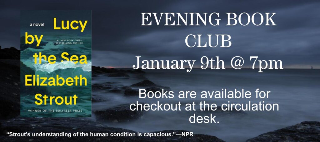 Library Clerk Sharon Godard will lead a discussion of Lucy by the Sea by Elizabeth Strout in the Mary S. Gray meeting room. Copies of the book are available for checkout from the circulation desk.