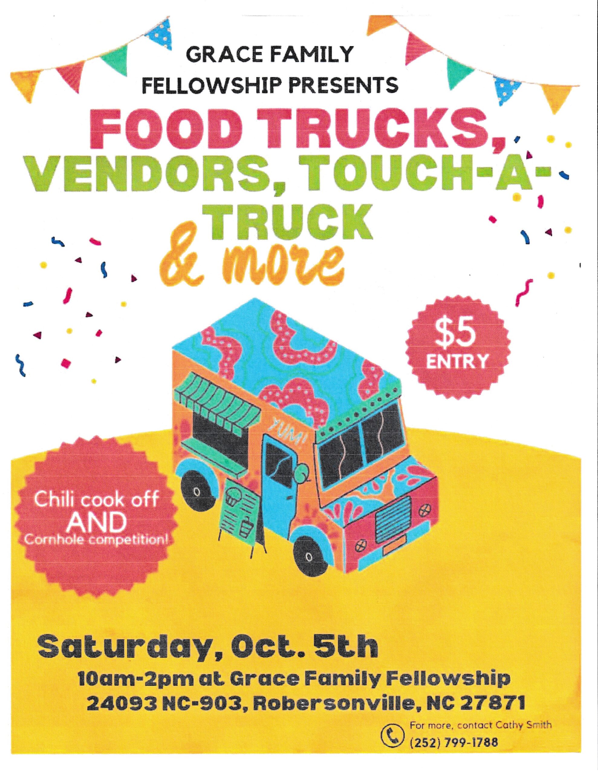 Food Trucks, Vendors, Touch-a-Truck, chili cook off, and Cornhole competition!
