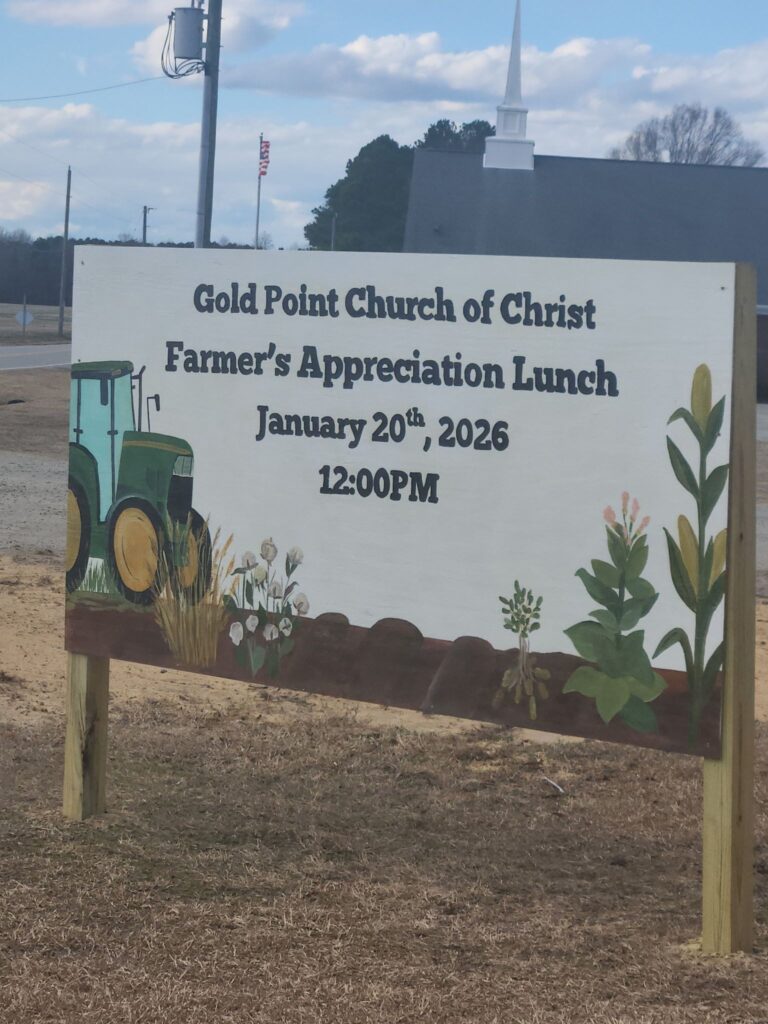 If you are part of the agricultural community, Gold Point Church of Christ invites you to join the annual Farmer’s Appreciation Day on Tuesday, January 20th. There will be a pig pickin’ at noon, and a prayer for a safe and successful season ahead!