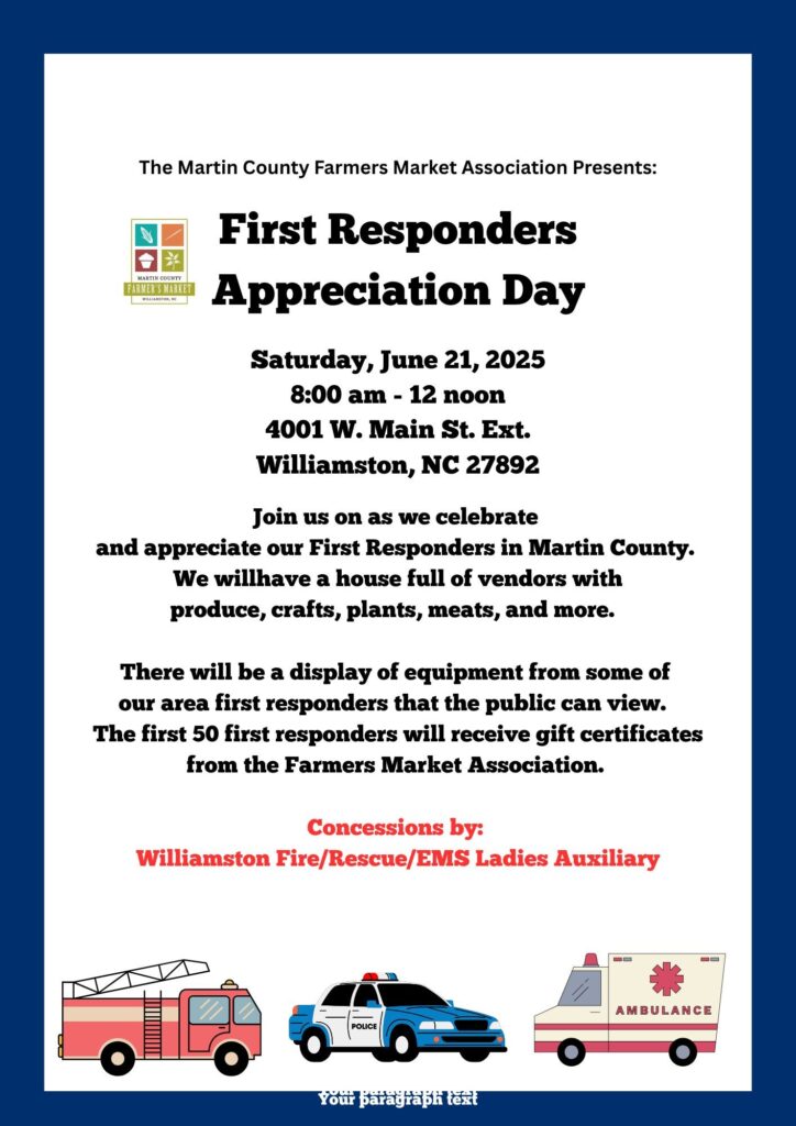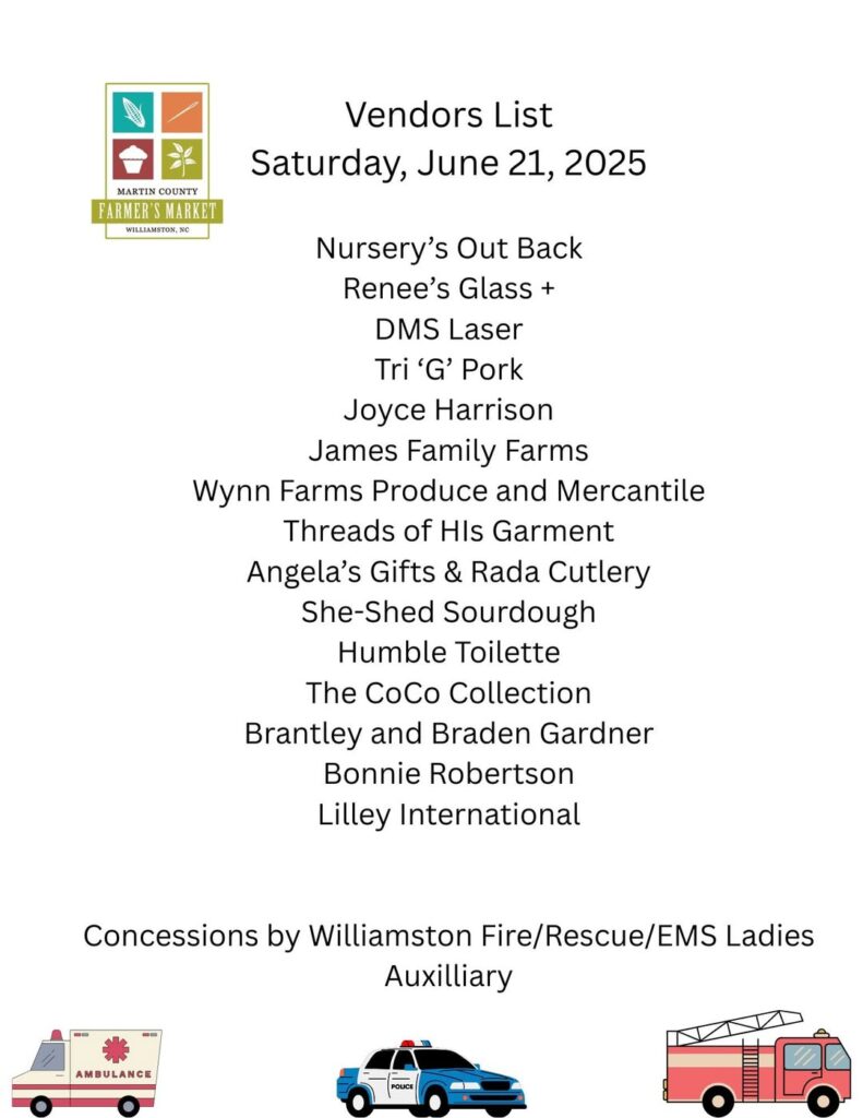 This special farmers market honors Martin County’s first responders and their service. Concessions will be provided by Williamston Fire / Rescue / EMS.