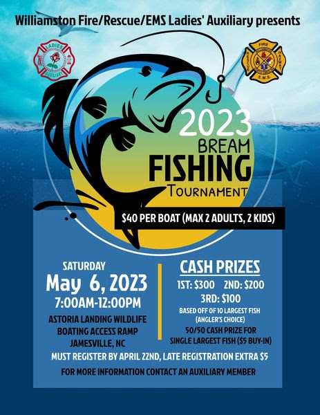 Now on to our biggest fundraiser of the year!! WFR Ladies’ Auxiliary will be hosting a bream tournament on May 6th. Please send registration forms to the fire department or get to an auxiliary member. We are still accepting sponsorships if you’d like to support this event! Just let us know! For assistance please contact an auxiliary member or Joy Pierce at 252-661-2796.