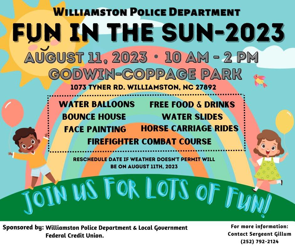 Join the Williamston PD and others in the community when they host Fun in the Sun at Godwin Coppage Park! Food, water slides, games, horse carriage rides, and a firefighter combat course!