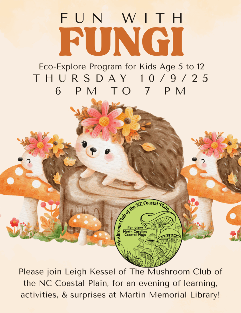 Please join Leigh Kessel of The Mushroom Club of the NC Coastal Plain for an evening of learning, activities, & surprises at Martin Memorial Library! This event is part of the Eco-Explore Program for kids aged 5 to 12. We hope to see you there!