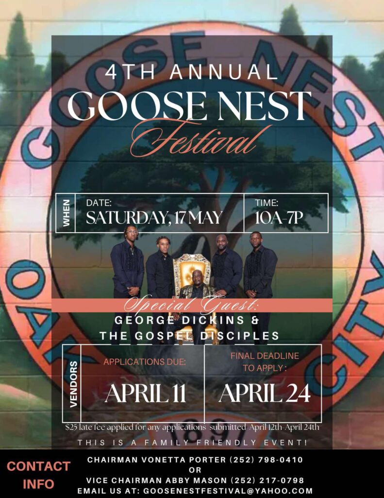 Get ready for the 4th Annual Goose Nest Festival on Saturday May 17th in the Town of Oak City. More details coming soon!