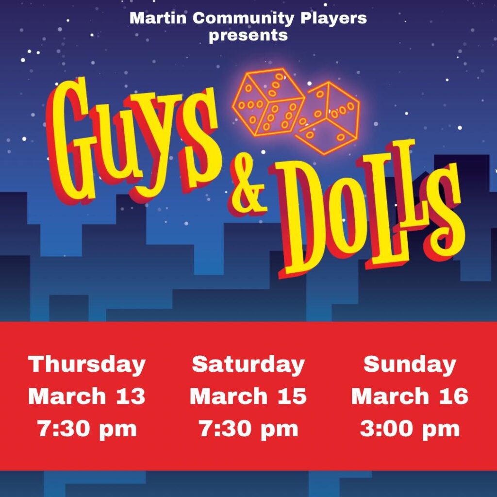 Martin Community Players present the musical Guys & Dolls on March 13th and 15th at 7:30 PM and March 16th at 3 PM at Martin County Auditorium. Come out for a night of song and dance with talented performers across Martin County.