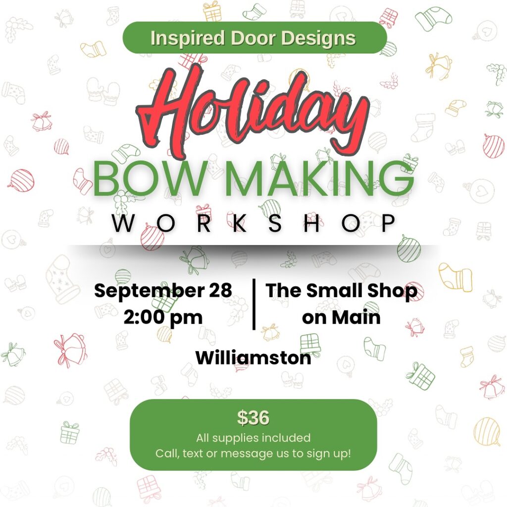 Join Inspired Door Designs at The Small Shop on Main in downtown Williamston for a Holiday Bow Making Workshop on Sunday, September 28th. Please call 252-495-1868 or 252-508-6605 to reserve your spot!