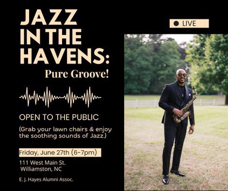 Friday, June 27th, E.J. Hayes Alumni Association presents Jazz in the Havens: Pure Groove! in downtown Williamston at 111 W Main St. DJ Chiefrocker with the mix from 5 PM to 6 PM, LIVE JAZZ MUSIC starting at 6 PM. Event until 11 PM. THIS EVENT IS – FREE – OPEN TO THE PUBLIC. Grab your lawn chairs and enjoy the soothing sound of jazz. JAYLEN’S FOOD TRUCK WILL BE ON SITE. Please share and invite your family and friends!