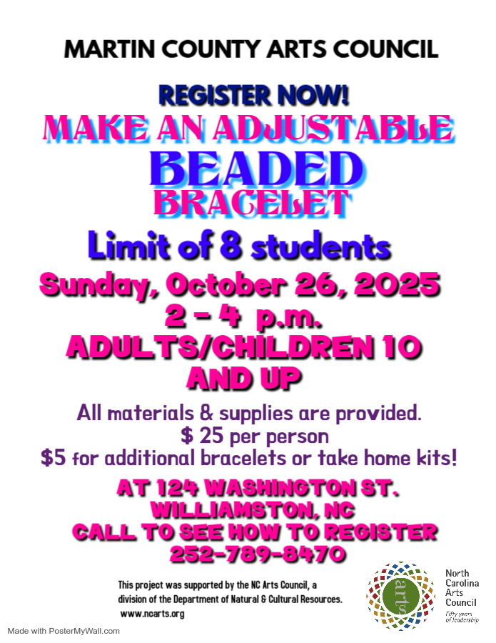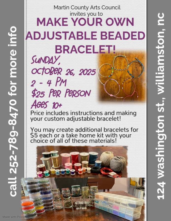 The Martin County Arts Council is hosting a jewelry-making class on Sunday, October 6th. Get crafty and make jewelry for you to wear and/or give to your loved ones for the holidays!