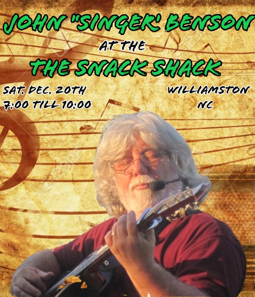 It’s time to go Snack Shackin’! Join John Benson at The Snack Shack at 101B W Main St in Williamston on Saturday night, December 20th, from 7 PM to 10 PM.