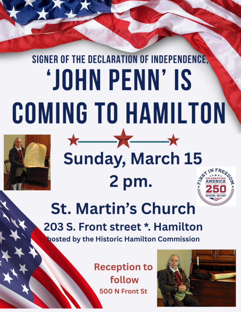 Hamilton is celebrating America250 with none other than one of the original signers of the Declaration of Independence, “John Penn”. Yes, Mark Pace, as John Penn, will be in full costume speaking about ‘his’ signing. Everyone is invited – history lovers, patriotic followers, history students, and lifelong learners. Join us at the historic St. Martin’s Episcopal Church for the presentation, followed by a reception at 500 N Front St.