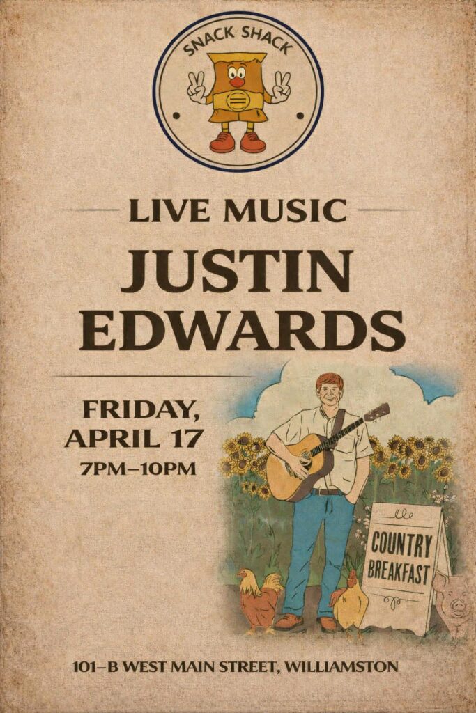 Friday, April 17th, head downtown for LIVE MUSIC at The Snack Shack. Local artist, Justin Edwards will be performing from 7 to 10 PM.