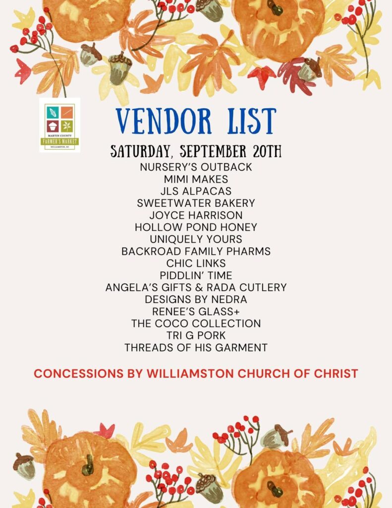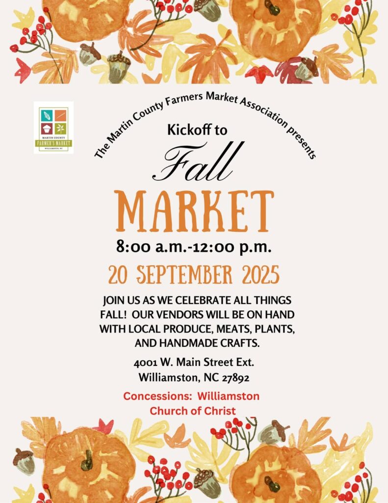 Head to the Kickoff to Fall Farmers Market on September 20th from 8 AM to noon and support local farmers and artisans. Have lunch and refreshments at the Concession Stand / Fundraiser for Williamston Church of Christ. Shop for locally made gifts, fresh produce, meat, and more!