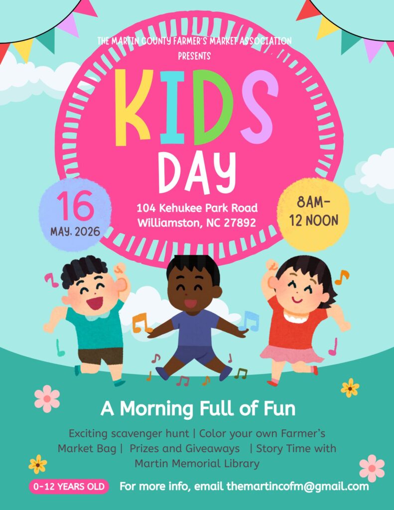 Join the Martin County Farmers Market on Saturday, May 16th, 2026, from 8 AM to 12 PM for their first-ever Kids Day. There will be a scavenger hunt, a color your own farmers market bag activity, farm animals, and story time with Martin Memorial Library (10 AM). All activities are free for children. Please help spread the word!